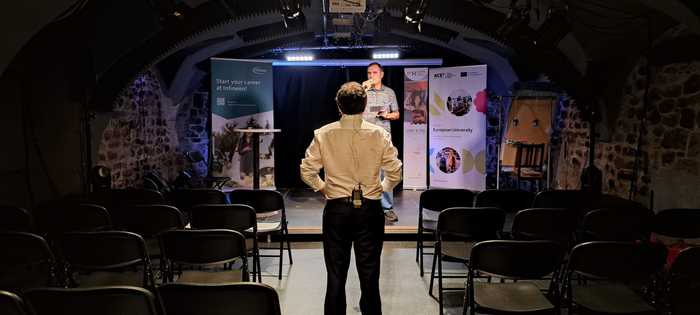 Przed wyjściem na scenę, uczestnicy i uczestniczki z Polski, Austrii, Niemiec i Portugalii wzięli udział w dwudniowych warsztatach z zakresu komunikacji naukowej. Poprowadził je Bernhard Weingartner, doświadczony ekspert, który zapoznał młodych badaczy z narzędziami i metodami, które pomagają w prosty sposób prezentować złożone zagadnienia naukowe. Warsztaty miały praktyczny charakter – była to okazja do przedyskutowania pomysłów, przećwiczenia swojego wystąpienia, a także wysłuchania pomocnych wskazówek. Dzięki temu finałowe prezentacje były nie tylko merytoryczne, ale też bardzo oryginalne.